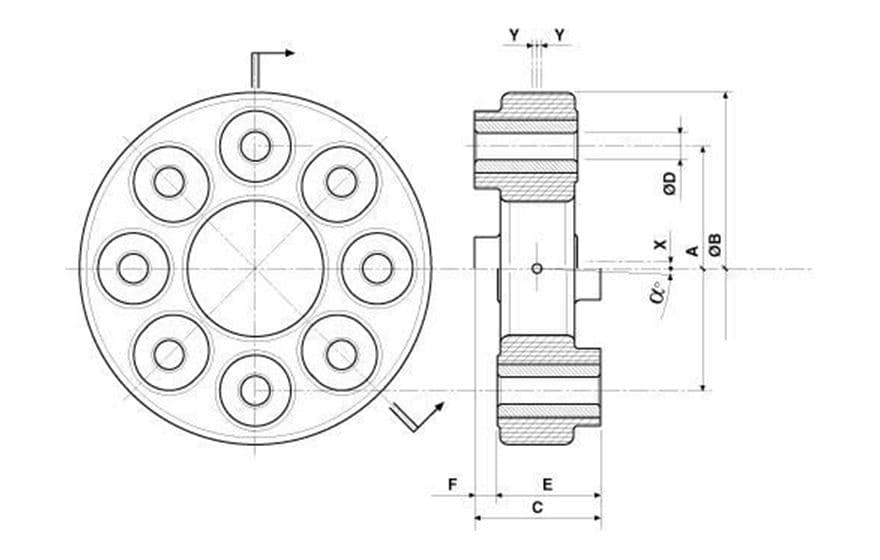 | COD. | Mt(Nm) | A | B | C | D | E | F | α° | X | Y |
